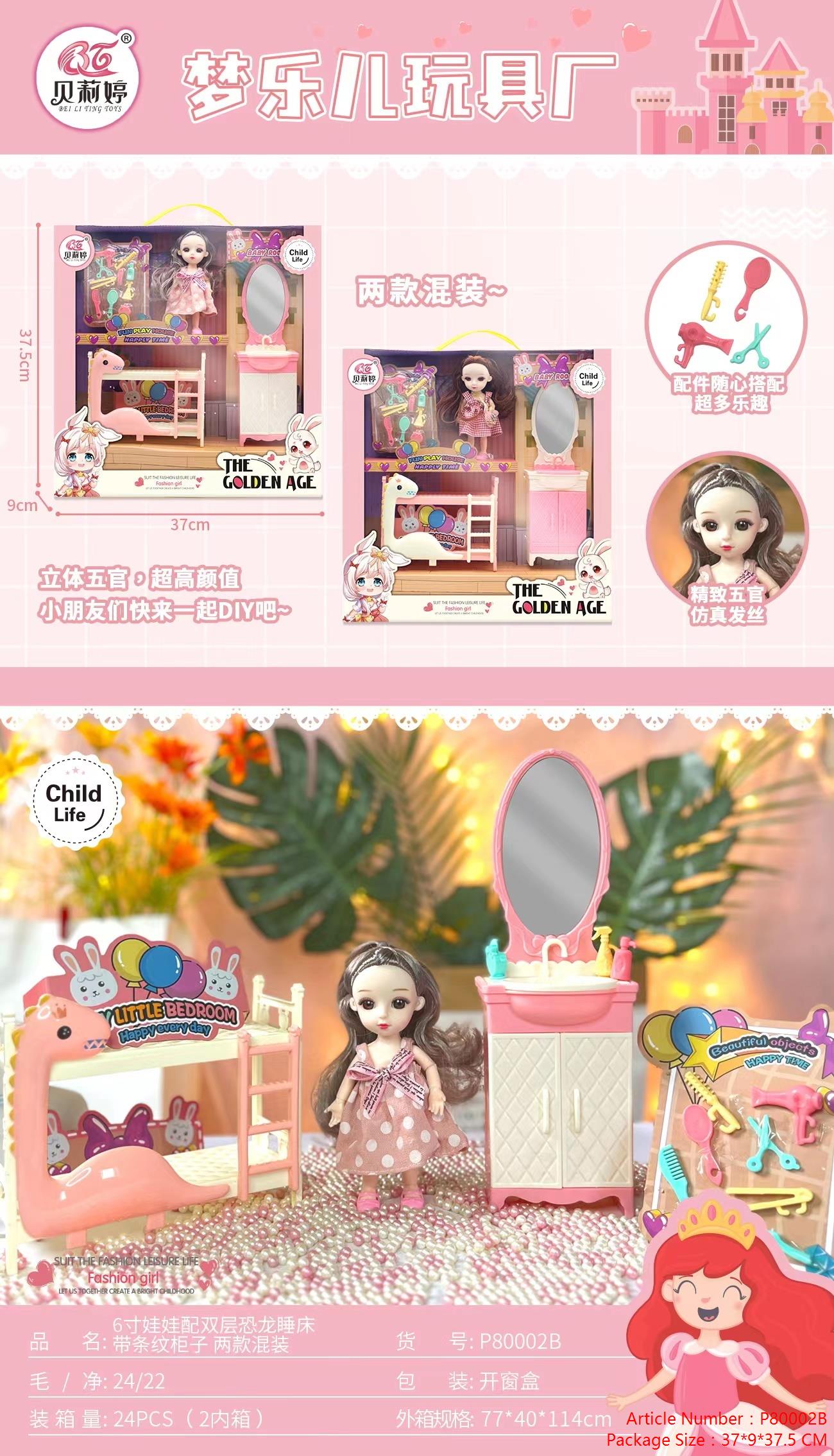 Название продукта: Кукла 6 дюймов с двухъярусной кроватью-динозавром и шкафом, ассорти из 2 моделей