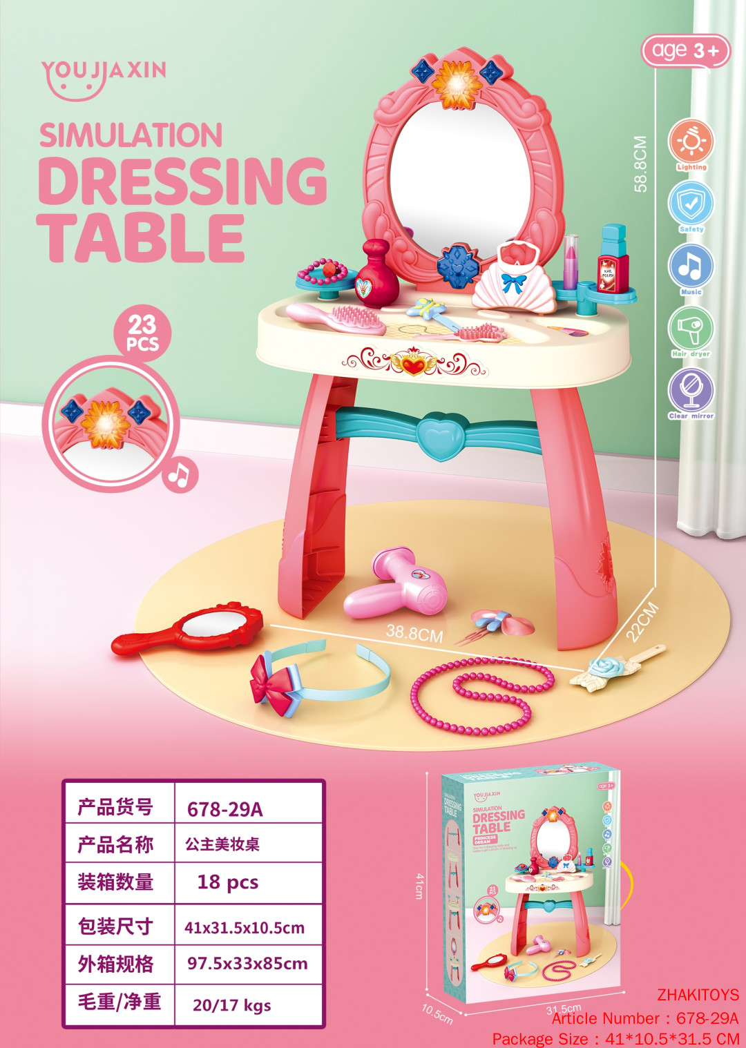 Примечания: Зеркало со светозвуковыми эффектами имитации ящика можно выдвинуть, чтобы открыть полупрозрачное зеркало, чистое и яркое, гладкий дизайн, разнообразные безделушки, чтобы любящие красоту дети изучали различные предметы ухода за собой.